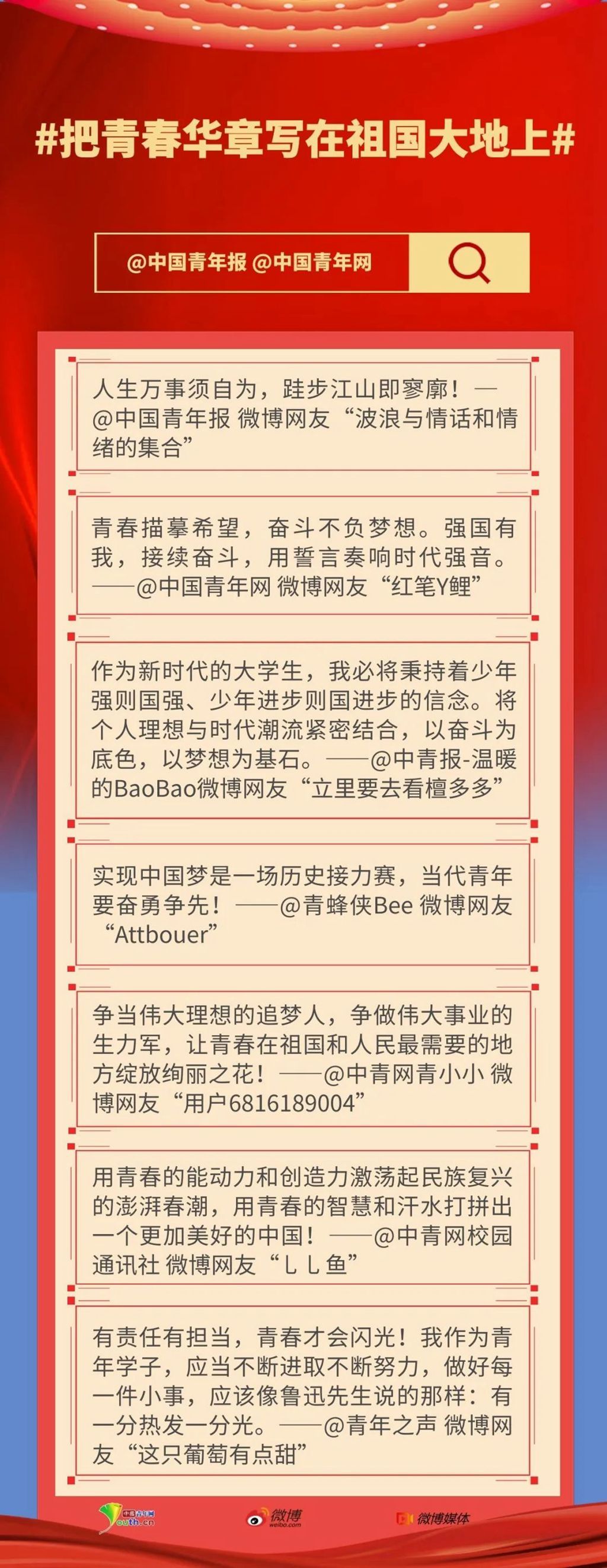 青春孕育无限希望,青年创造美好明天。党和国家的希望寄托在青年身上!实现中国梦是一场历史接力赛,作为伟大理想的追梦人、伟大事业的生力军,青年要胸怀“国之大者”,立正心、明大德、行大道,在祖国和人民最需要的地方,用青春的力量、青春的涌动、青春的创造,激荡起民族复兴的澎湃春潮,推动中华民族勇毅前行、屹立于世界民族之林。(中国青年网评论员)