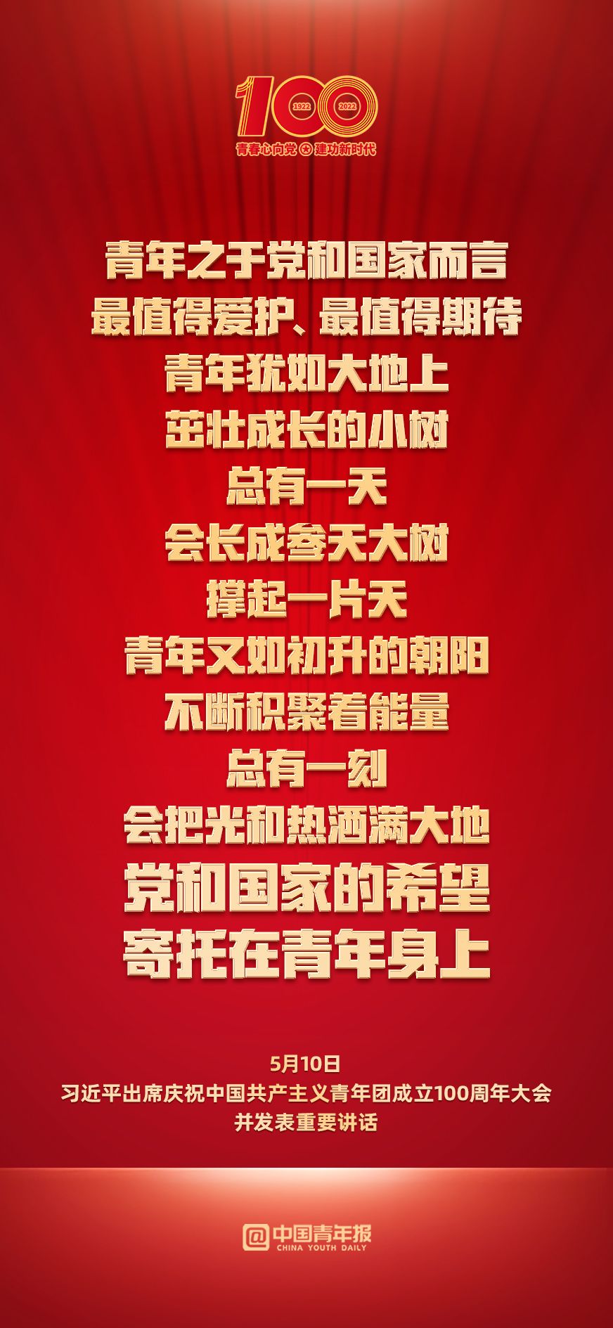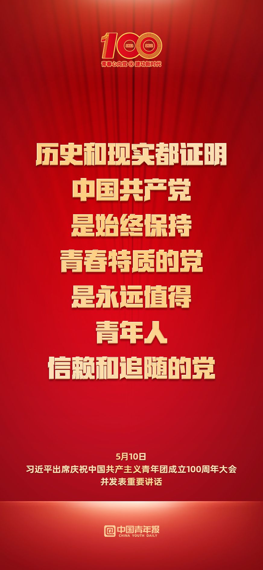 庆祝中国共产主义青年团成立100周年大会5月10日上午在北京人民大会堂隆重举行。中共中央总书记、国家主席、中央军委主席习近平出席大会并发表重要讲话。