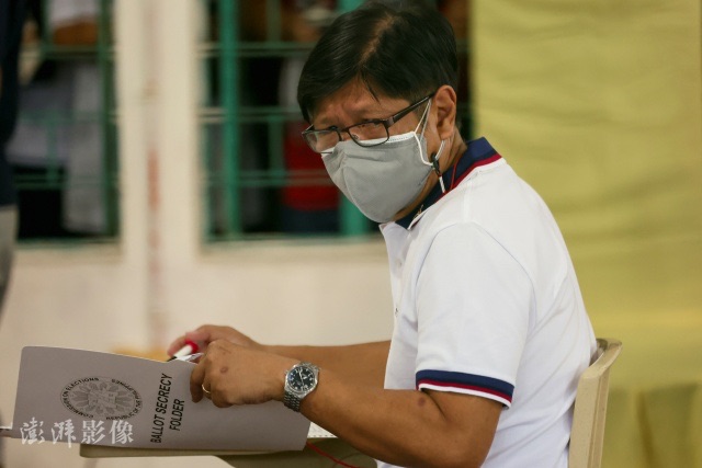 当地时间5月9日,菲律宾前总统费迪南德·马科斯之子、总统候选人小马科斯参加投票。图自澎湃影像