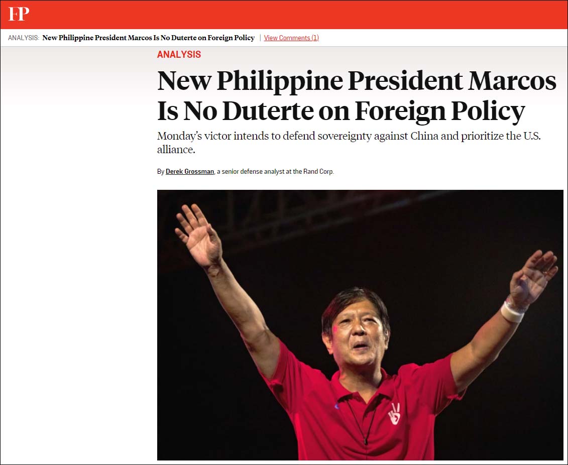 与大部分媒体的分析观点不同,美国《外交政策》杂志(Foreign Policy)5月10日则撰文,替小马科斯的政策“解密”。正当其他媒体认为小马科斯是力挺杜特尔特对华政策时,该杂志称其在外交政策层面并非是杜特尔特的翻版,他打算在中国面前“捍卫主权”,并优先考虑与美国结盟。