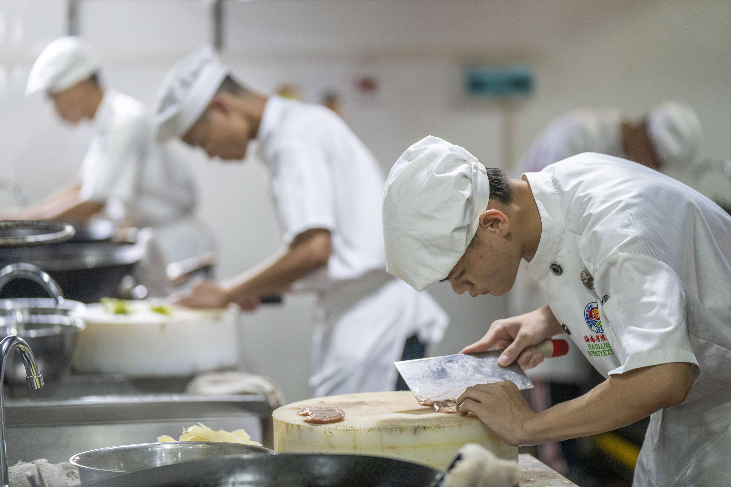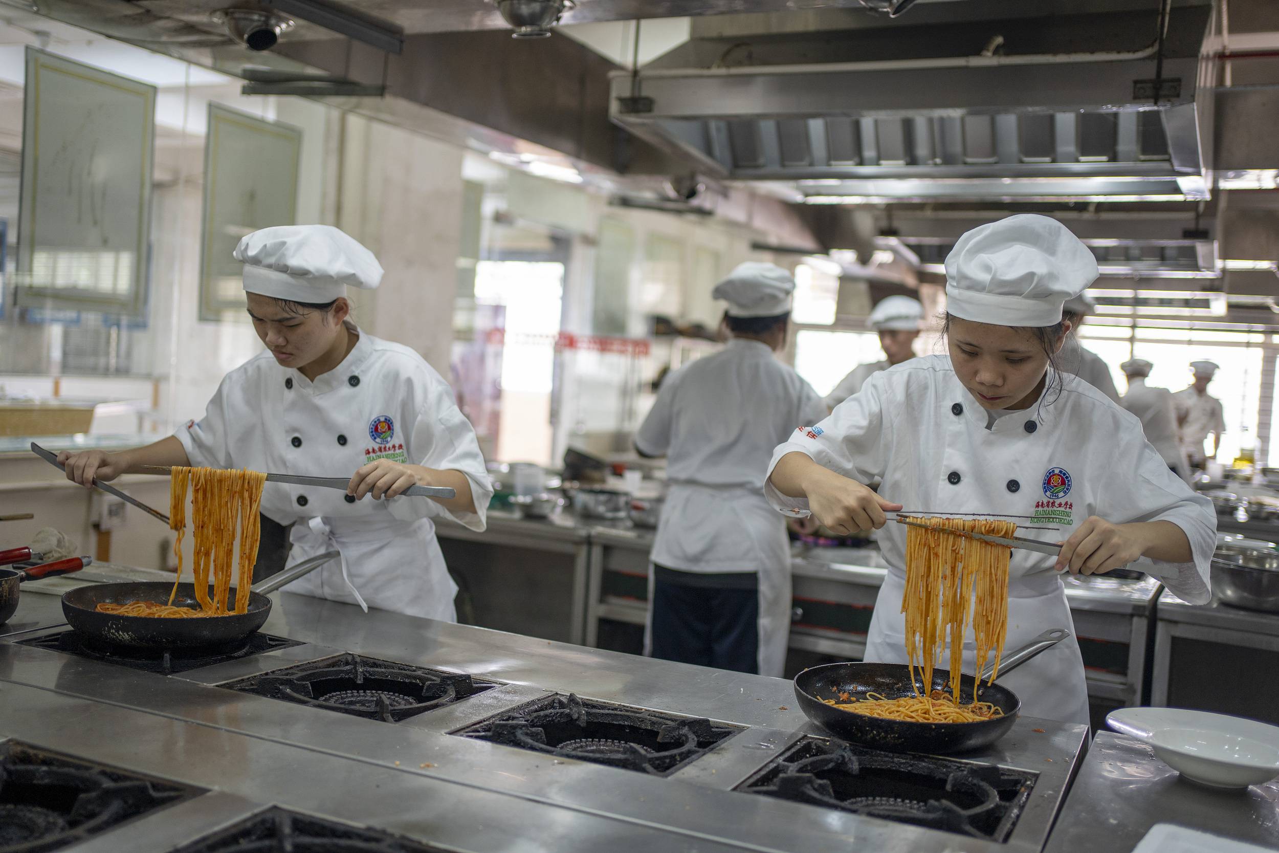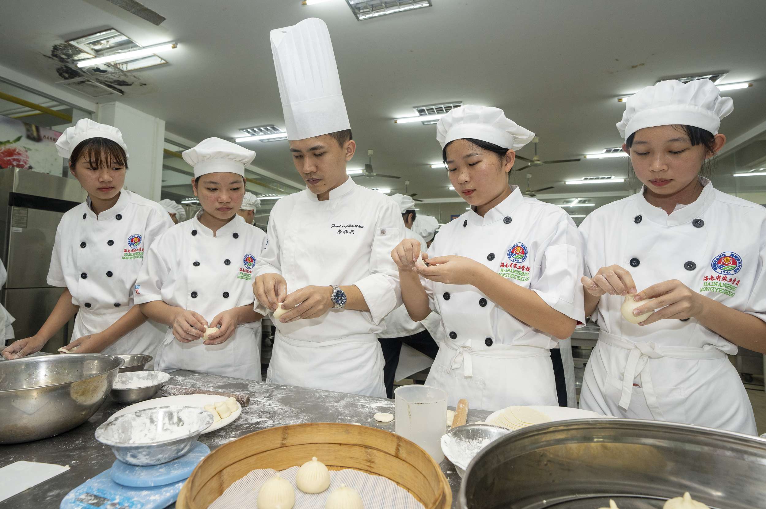 2022年5月9日,海口,在海南省农业学校,老师劳振兴学生们在上烹饪课。该校适应市场要求,着重培养学生职业技能与创新能力。