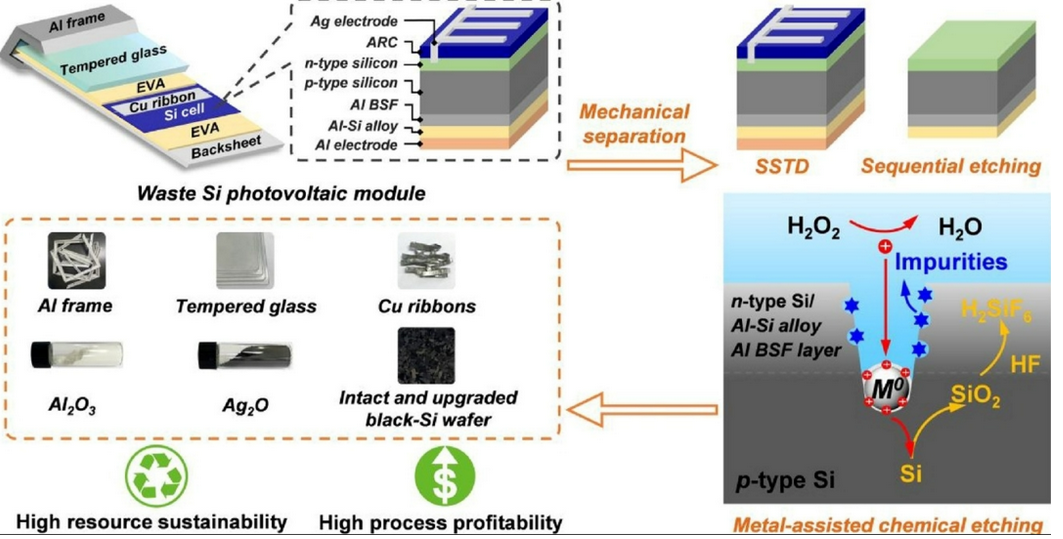 国科大博士生导师、中科院城市环境研究所研究员汪印团队提出了以溶剂热溶胀-热处理联合法和序批式酸蚀刻预洁净耦合金属催化蚀刻超洁净处理为核心技术的废弃晶体硅光伏组件高效资源化集成创新工艺。