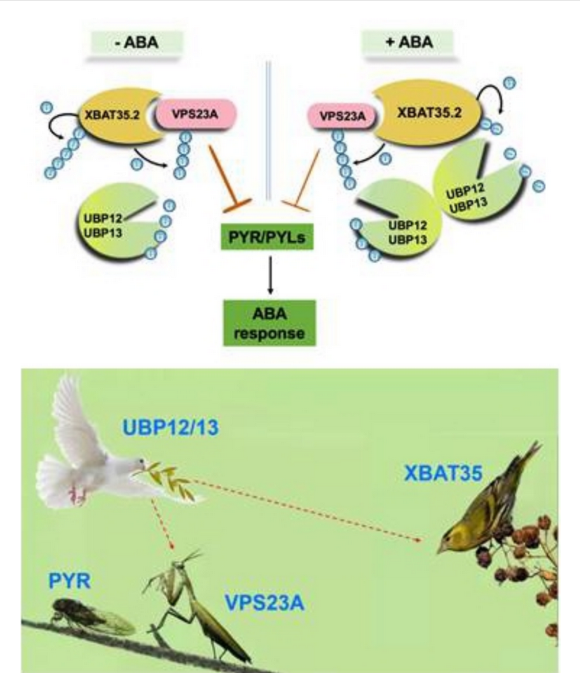 国科大博士生导师、中科院遗传与发育生物学研究所研究员谢旗团队研究进一步发现VPS23A受到E3泛素连接酶XBAT35.2的泛素化修饰,并进入26S蛋白酶体降解,从而释放VPS23A对ABA受体的抑制作用,最终促进ABA信号响应。ABA受体、VPS23A和XBAT35.2三者之间的关系是经典的“螳螂捕蝉,黄雀在后”。
