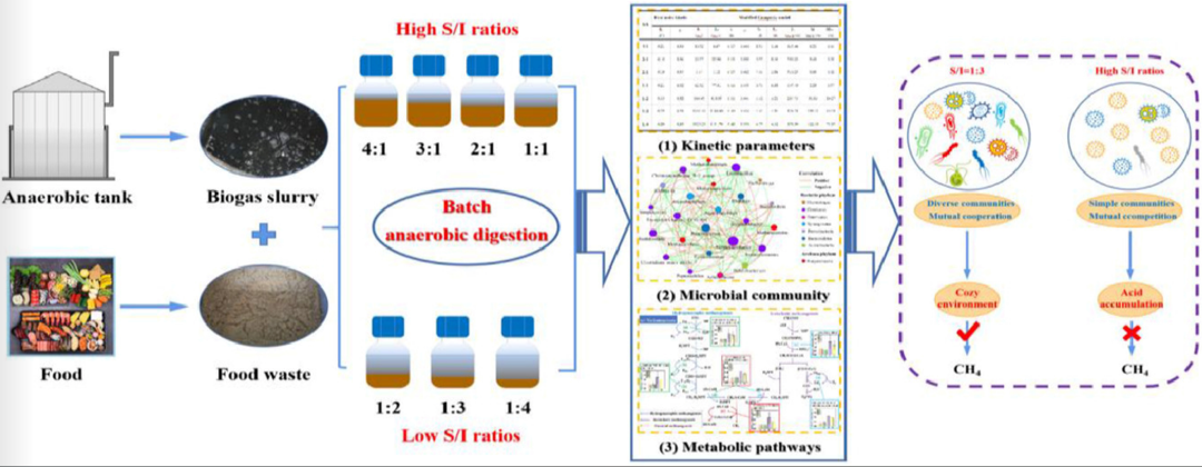 国科大博士生导师、中科院城市环境研究所研究员张胜华团队探讨了不同S/I对餐厨垃圾厌氧消化过程中动力学参数、微生物群落和代谢途径关系的影响。研究结果表明:S/I=1:3的甲烷产量最高,细菌与古菌的多样性最为丰富。与其他S/I相比,S/I=1:3中微生物之间的合作关系更为明显。值得注意的是,无论是氢营养型还是乙酸营养型产甲烷代谢途径,S/I=1:3的产甲烷关键酶编码基因相对丰度均为最高。这一结果将有助于揭示微生物与底物的比例关系对厌氧消化生化代谢过程的影响机制,从而为餐厨垃圾厌氧消化的定向调控提供有效指导。