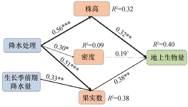 国科大博士生导师、 中科院西北生态环境资源研究院研究员左小安团队研究了3年的降水量增减(±50%)对乌拉特荒漠草原植物骆驼蓬(Peganum harmala)的数量特征(分枝数、果实数和植株密度)、地上生物量(AGB)和功能性状的影响,并建立结构方程模型(SEM)来探究其影响机制。