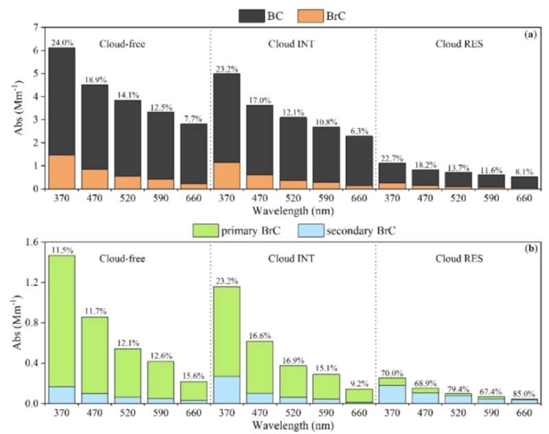 基于地用逆流虚拟撞击器与黑碳仪联用在线观测获得云滴残余颗粒(云滴经干燥获得)、云间隙颗粒和环境颗粒(无云时的背景颗粒)的光吸收系数;使用云雾水收集器和中流量采样器采集了云水和PM2.5滤膜样品,结合紫外-可见分光光度计和荧光分光光度计等对云水和PM2.5滤膜样品进行分析对比,研究了云中棕色碳的光学性质及云过程对棕色碳形成的影响。