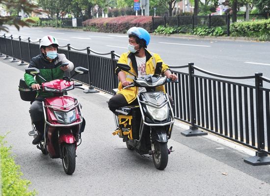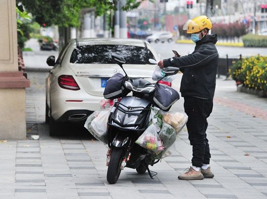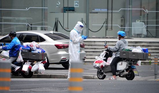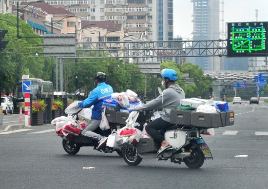 2022年5月10日,上海,街头外卖员逐渐增多。