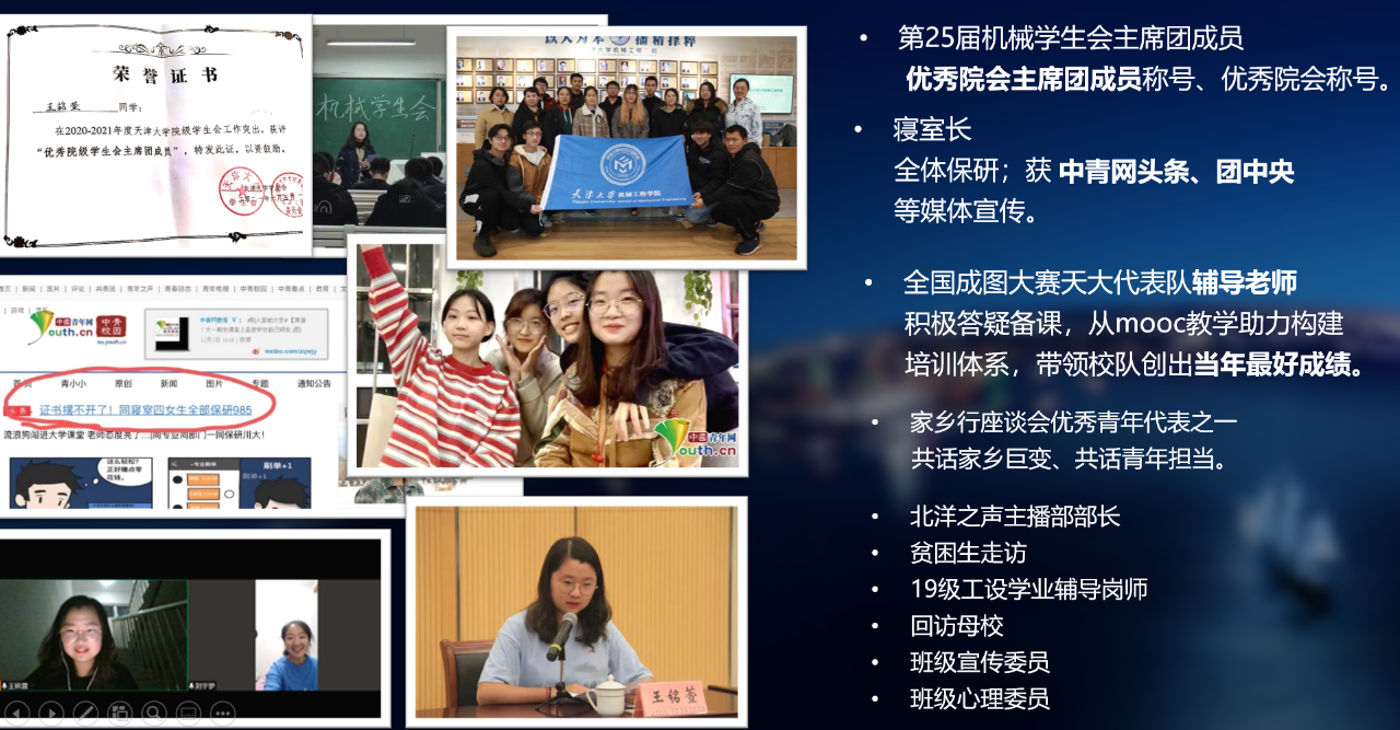 她曾任第25届机械学生会主席,带领院会探索改革浪潮下的新姿态,从院班座谈会到院学生会体系探索性变化,获评天大优秀院会主席团成员称号、优秀院会称号(集体)