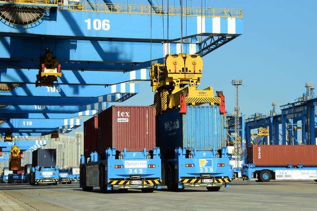 资料图 在山东港口青岛港全自动化码头,AGV来回穿梭。新华社发