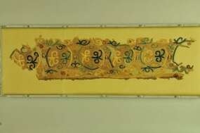 这件刺绣说法图属寺院供奉物,残损严重,从保存部分可以辨认出一身着红色袈裟结跏趺坐在莲座上佛的下部。佛左侧残存侍立的菩萨下半身,立于莲花之上。佛与菩萨之间,填充以忍冬等植物纹样。刺绣最下方为供养人和发愿文,发愿文居中,供养人分列左右。