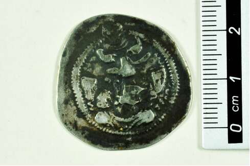 萨珊王朝第五代王卑路斯时期银币。正面磨损严重,边缘围绕一圈联珠纹,中间为半身王者像,脸向右,王冠虽残但尚可辨其后部为一对翼翅,冠顶新月环抱圆形。王者像面前由肩上飘起的带状物与髻后的一条对称,围绕王者像有模糊难辨的钵罗婆文字。背面边缘联珠纹,中央为柱状祭坛,祭坛上火焰熊熊燃烧,五角星和新月在火焰左右对称,祭坛两侧各站立头戴高冠、足踏高筒靴的祭司,外侧均有铭文,因磨损严重无法辨识。