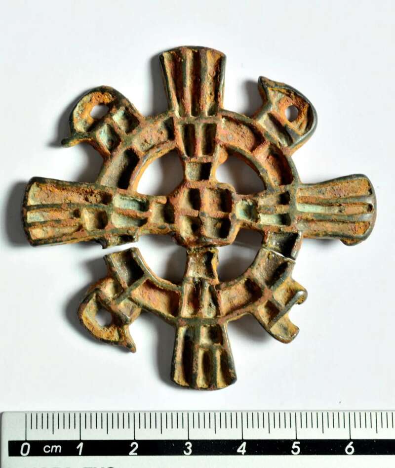 青铜铸造。牌饰以十字架为骨干,各端均伸出圆环,环外缘处各有一只鸟喙向逆时针方向的鸟头,共4只(其中一只略残)。圆环和十字架以及鸟头部分均有凹槽,原镶嵌物已无存,从形式分析应是佩戴的徽章,这件珍贵的景教遗存物,是敦煌作为丝绸之路多种文明交汇地的又一例证。