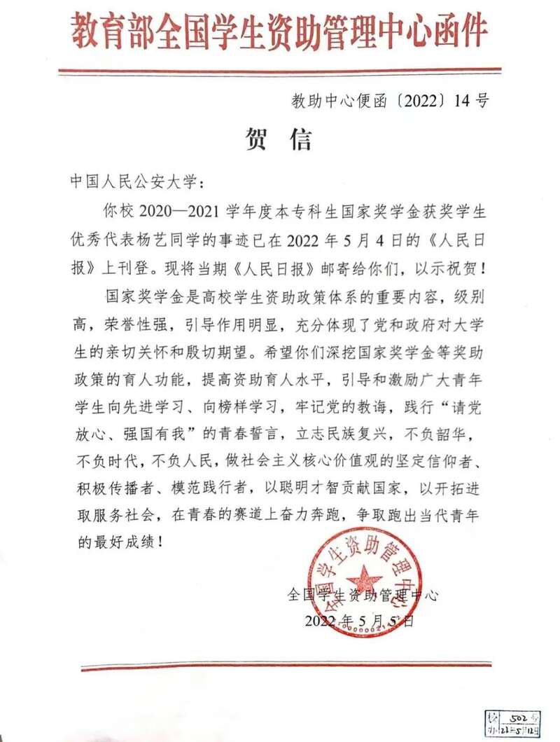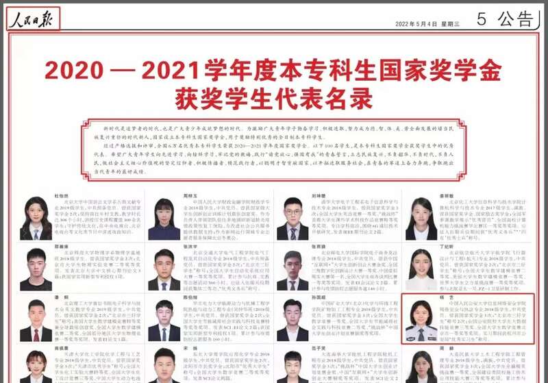 2022年5月4日,《人民日报》专版刊登《本专科生国家奖学金获奖学生代表名录》,该名录从全国6万名荣获2020-2021学年度国家奖学金的优秀本专科学生中选拔出100名优秀代表展示他们的风采,旨在激励广大青年学生向先进学习、向榜样学习,牢记党的教诲,践行“请党放心,强国有我”的青春誓言,立志民族复兴,不负韶华,不负时代,不负人民,做社会主义核心价值观的坚定信仰者、积极传播者、模范践行者,以聪明才智贡献国家,以开拓进取服务社会,在青春的赛道上奋力奔跑,争取跑出当代青年的最好成绩。