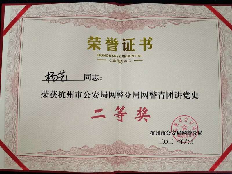 专业实习期间,恰逢中国共产党建党100周年,在学理论、悟思想、讲体会、显担当的浪潮中,杨艺积极报名参加杭州市公安局网警分局“学史铭志,循脉而行——杭州网警青年说”党史宣讲活动,在西湖孤山北侧的鲁迅坐像处,宣讲红色故事,传承红色精神,并荣获建党百年杭州“网警青团讲党史”活动二等奖。
