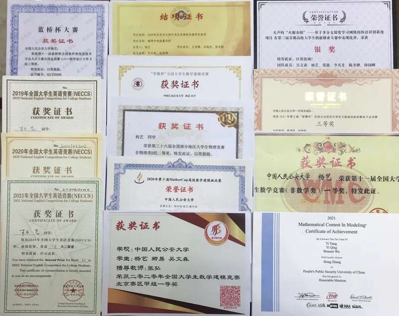 杨艺在校期间学习成绩优异,前6学期绩点为全校第一,连续三年获得“教育部国家奖学金”,获得“北京市三好学生”荣誉称号两次,获得“个人嘉奖”两次,连续三年获得校级“三好学生”,连续六学期获得校级一等奖学金,获得绳旭奖学金、特别优秀奖学金、网络安全竞赛奖学金各一次,获得校级“优秀团员”两次,获得2021年美国大学生数学建模竞赛Honorable Mention和2020年全国大学生数学建模竞赛北京赛区一等奖等省部级及以上奖励20余项,已保送攻读本校研究生。实习期间,工作认真负责,被浙江省公安厅网安总队表扬,获得杭州市公安局“优秀实习生”荣誉称号。
