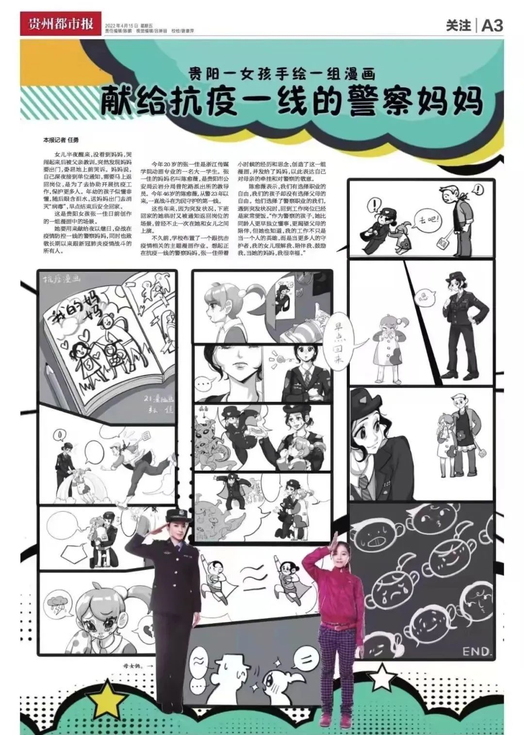 近日,我校动画与数字艺术学院21级漫插画专业张一佳创作的手绘漫画《我的妈妈》登上了《贵州都市报》。漫画中,张一佳用简洁明了的线条,活泼可爱的画风勾勒出一位无私奉献的警察形象,她把这幅画献给自己奋战在抗疫一线的警察妈妈,同时也借此来致敬所有为抗击疫情做出贡献的人。