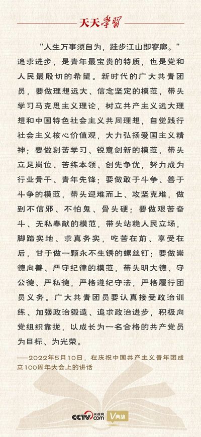 5月10日上午,庆祝中国共产主义青年团成立100周年大会在北京人民大会堂隆重举行,习近平总书记出席大会并发表重要讲话。在讲话中,总书记用古诗“人生万事须自为,跬步江山即寥廓”寄语新时代的广大共青团员,强调新时代的广大共青团员要做理想远大、信念坚定的模范,要做刻苦学习、锐意创新的模范,要做敢于斗争、善于斗争的模范,要做艰苦奋斗、无私奉献的模范,要做崇德向善、严守纪律的模范。