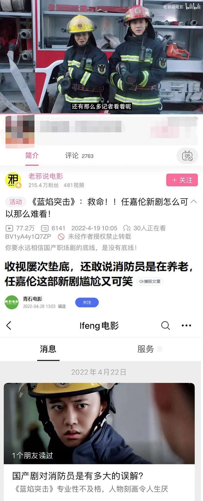 此次被中艺博悦文化传媒发出律师函的B站“吐槽”红人“老邪说电影”,曾是被陈凯歌方投诉对象之一,当时他在视频标题中称陈凯歌“双标”,并在评论时用了“小心眼”“睚眦必报”等说法。此次针对《蓝焰突击》,“老邪说电影”在视频标题中直接称这部剧“难看”。而“Ifeng电影”在提要中写到该剧“专业性不及格,人物刻画令人生厌”,“青石电影”则引用剧中部分台词,称其敢说“消防员是在养老”。