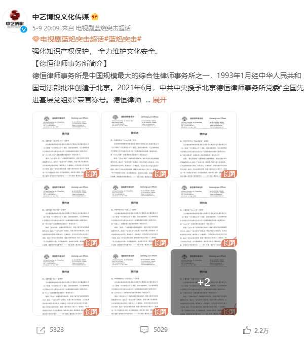 日前,电视剧《蓝焰突击》的出品方中艺博悦文化传媒在微博置顶了11封律师函,称部分影视评论自媒体“侵犯著作权”“恶意诽谤”,涉及豆瓣、B站及凤凰网等平台用户和栏目。