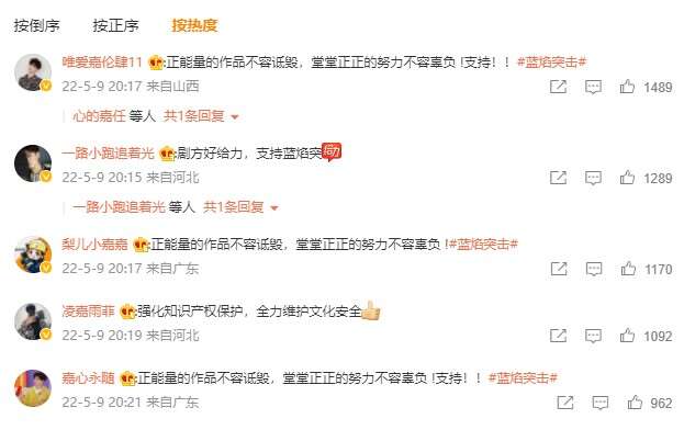 在影视评分“必争之地”豆瓣网上,《蓝焰突击》显示4月16日开播,截至5月15日仍未开放评分。在短评页面,有不少一星差评,而130篇剧评中,则有少量一星差评和大量五星好评,居中评价极少。而在中艺博悦文化传媒的置顶微博中,高赞评论则重复出现“正能量的作品不容诋毁,堂堂正正的努力不容辜负”这样的话。