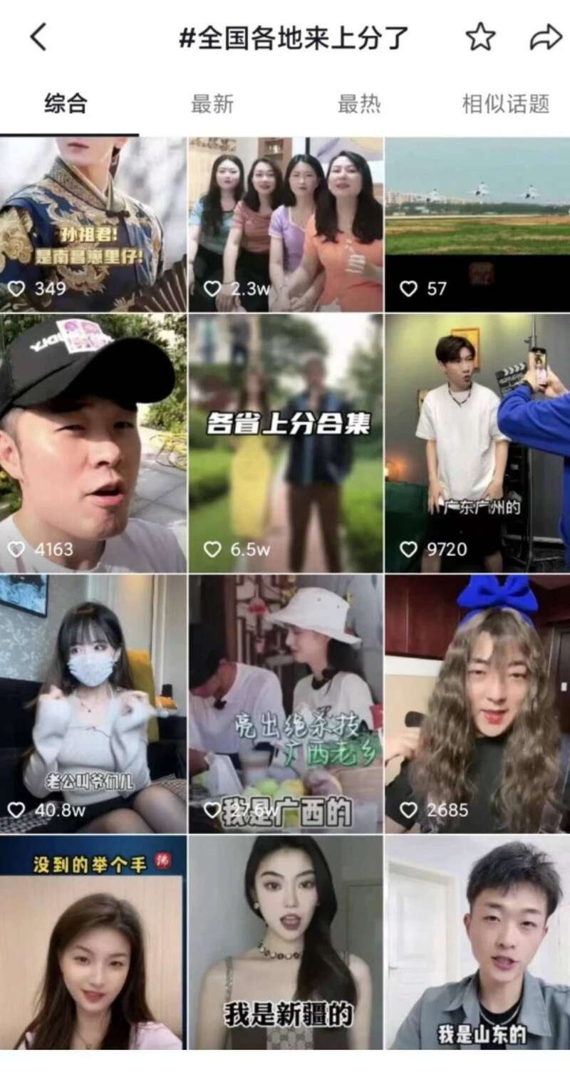 “我是江苏的,江苏无锡的……”“我是四川的,四川成都的……”全国各地网友按捺不住,随即出现了一大批效仿者,用自己的方言改编了歌词,同样以喊麦的方式念出自己的家乡省市区地区,“比拼”起家乡特色,从四川火锅到广东早茶,从陕西肉夹馍到新疆大盘鸡,从吃着雪糕蒸桑拿的东北到网红打卡点密布的西南,热闹非凡。据不完全统计,江苏、辽宁、吉林等20多个省的50多个城市网友参与这场全国“上分”大战。