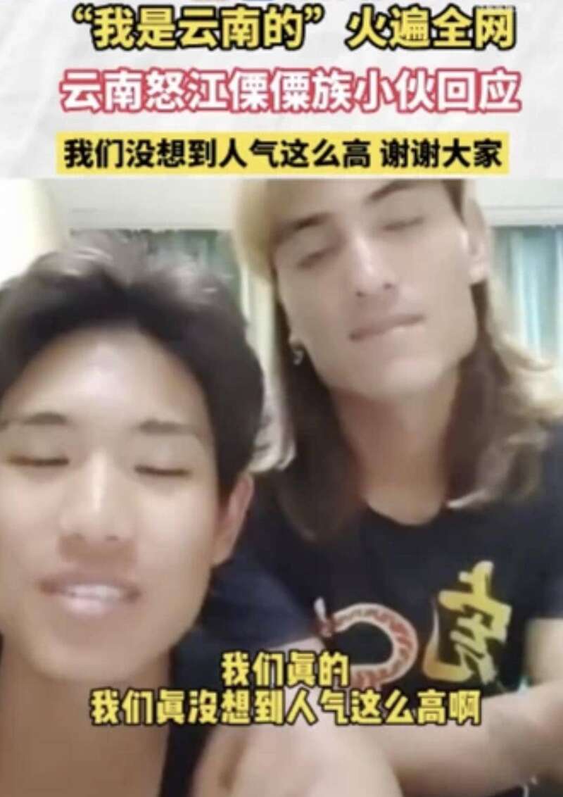 魔性洗脑视频里的这对傈僳族兄弟也因此走红,2022年5月11日晚,他们推出首次直播,围观人数就超1200万人次。兄弟俩表示,他们是怒江兰坪县人,不是这首歌的原作者,只是打工时听到了这首歌,就模仿着对了一下口型,没想到火了。随后《我是云南的》原作者露面,并与傈僳族兄弟进行梦幻联动,原作者表示他是根据网络上一些热门歌曲的节奏,加入了自己家乡和民族的内容而创作了这首歌,“除了好玩,也想借此宣传家乡,让外面的人听听我们们民族的语言,有机会来怒江看看。”