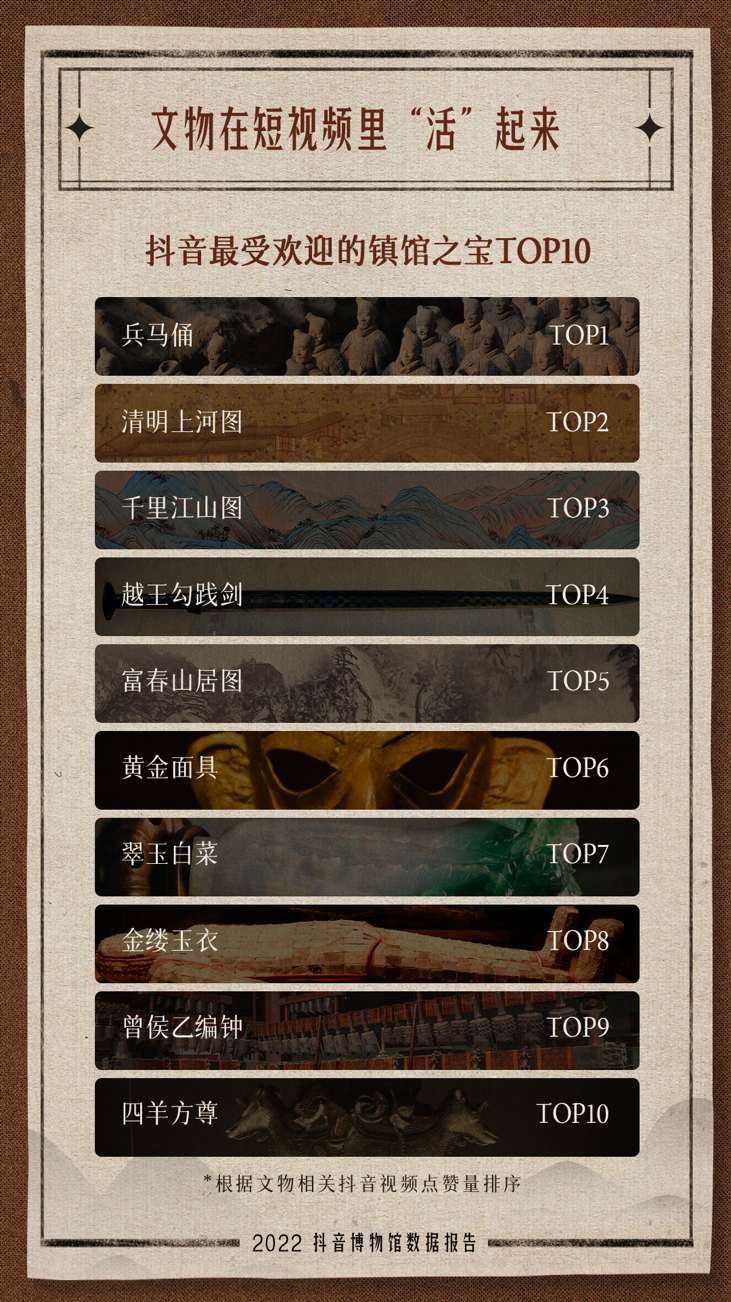 通过短视频,观众可直接观赏“镇馆之宝”级别的藏品,与历史和传统对话。报告显示,兵马俑、《清明上河图》、《千里江山图》等入选抖音最受欢迎十大镇馆之宝。真珠舍利宝幢、莲鹤方壶 、象首耳兽面纹铜罍等入选抖音关注度提升最快的文物前十名。