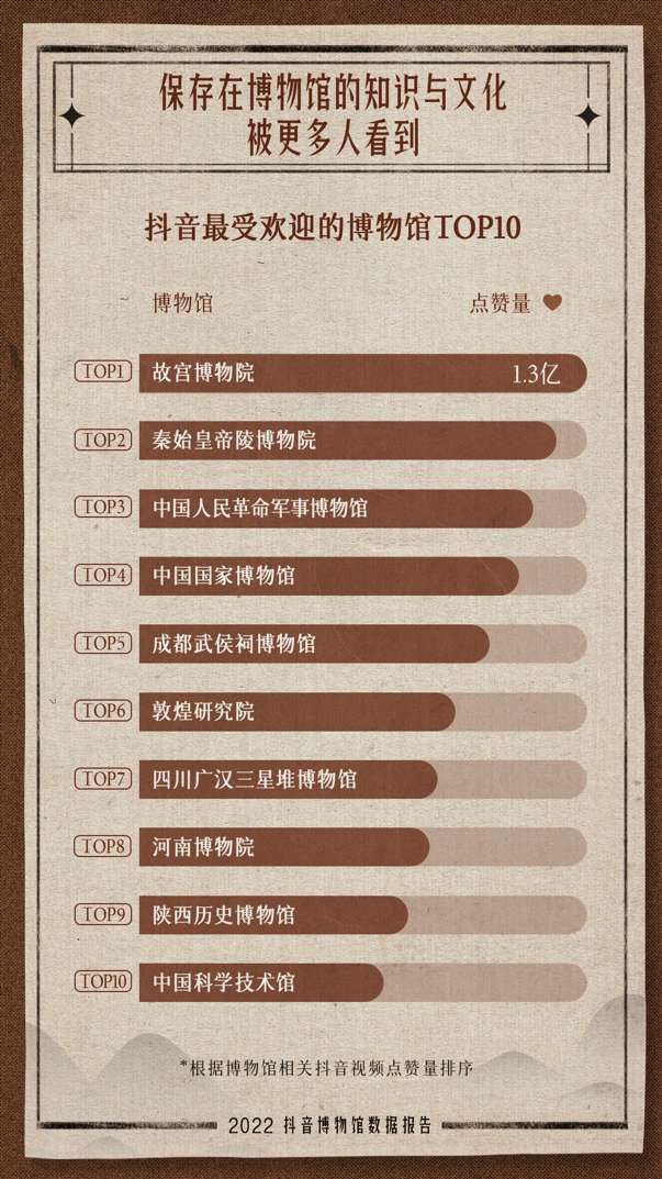 报告显示,根据相关视频点赞量排序,故宫博物院、秦始皇帝陵博物院、中国人民革命军事博物馆、中国国家博物馆、成都武侯祠博物馆等入选抖音最受欢迎十大博物馆。其中,故宫博物院相关视频被抖音网友点赞超过1.3亿次。