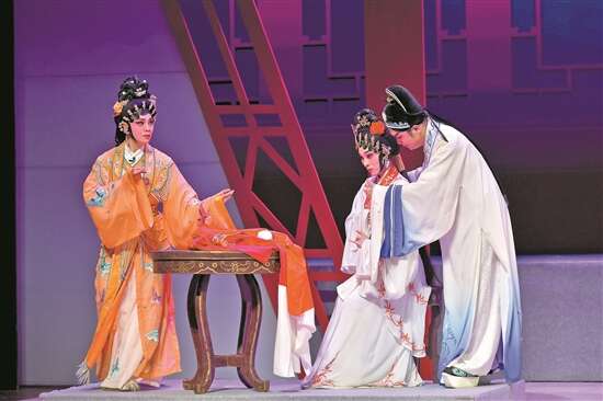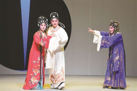 粤剧《胡不归·颦娘》剧照,陈骏旻(中)饰萍生,莫燕云(左)饰颦娘 文瑶 摄