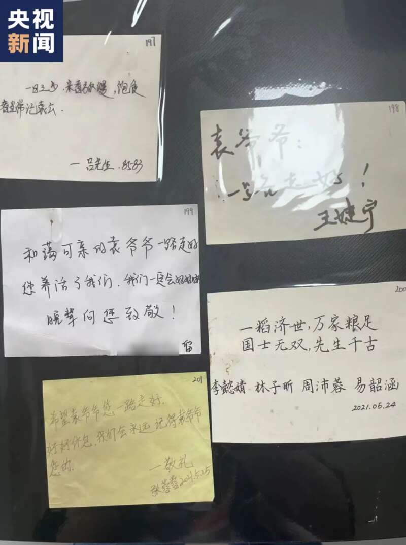 袁老去世后来自全国各地的人们送来鲜花和悼念卡片湖南杂交水稻研究中心里20多名年轻人自发前往试验田雕塑旁、殡仪馆等地收集鲜花上的卡片