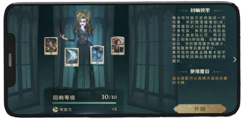另一方面,《哈利·波特》系列的叙事主线是主角哈利从麻瓜世界步入魔法世界去寻找身份的历险旅程,众多角色的成长和作者的人文关怀一直贯穿于这一旅程中。但是,由于《魔法觉醒》开发者太过在意玩法的趣味性,导致这部游戏与原作世界观的背离。例如,在《哈利·波特》系列原著中,贝拉·莱斯特兰奇将伏地魔的党羽食死徒传送到霍格沃茨,对全校师生进行了屠杀。同时,魔法部禁止巫师使用三大“不可饶恕咒”,使用者会被判处阿兹卡班终身监禁。然而,《魔法觉醒》中的贝拉属于回响系统,是一位持续爆发快节奏打法的强势角色,其技能为攻击敌方巫师频次累积到36次后,玩家能够召唤出两只食死徒释放钻心咒。在这种情况下,无论对战的巫师选择何种卡组,只要玩家不能及时解决掉一群怪兽,基本上就宣告了本场战斗告负。就PvP模式来说,贝拉属于高强度的回响卡牌选择,因此,在实际游戏过程中,有不少玩家为了胜利而追求强大的黑魔法。这种鼓励和引导玩家使用黑魔法的游戏设计和原作价值观是完全相悖的。