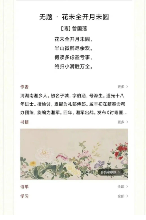 此外,“北大满哥”说,刘德华在广告提及的那首诗,除了第一句是引用曾国藩,后面三句是自己原创,这也让网友展开“考据”。侯印国说,“花未全开月未圆”这一句,其实出自宋代蔡襄的诗《十三日吉祥探花》,全诗为 “花未全开月未圆,看花候月思依然。明知花月无情物,若使多情更可怜。”曾国藩生平非常喜欢这七个字,《曾国藩家书》中收录有他给亲友的书信,就写道:“平日最好昔人花未全开月未圆七字,以为借福之道,保泰之法,莫精于此。”