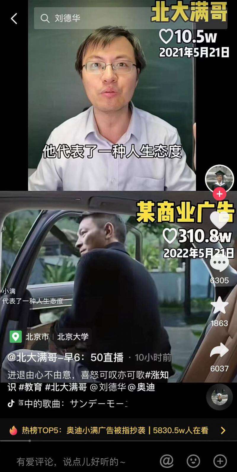 网友沉浸在刘德华营造的“小满”文化意境中没多久,就被自媒体“北大满哥”维权的声浪警醒。“几乎整篇都是截取自我去年小满的视频文案,里面的诗词是我自己做的原创命名诗。”在朋友圈,“北大满哥”名为《被抄袭了过亿播放的文案是什么体验?》的视频也广为流传。