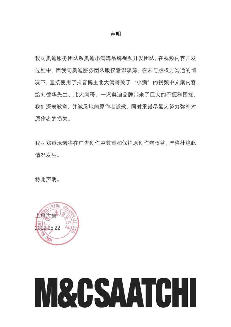 视频中将两条视频进行对比,可见文案内容极度相似,引用诗句也完全一致。网友神评论,“查重率99%”、“人生没有大偷,只有小偷”。随后,奥迪致歉声明坐实抄袭。致歉中提及,“该视频由创意代理公司M&CSaatchi提报并执行,本着不回避问题的原则,我们已责成其尽快就所涉文案侵权情况进行处理,给公众一个满意的答复。”需要为抄袭负责的视频开发团队上思广告公司M&CSaatchi在回应中承认,“因我司奥迪服务团队版权意识淡薄,在未与版权方沟通的情况下,直接使用了抖音博主北大满哥关于‘小满’的视频中文案内容”。