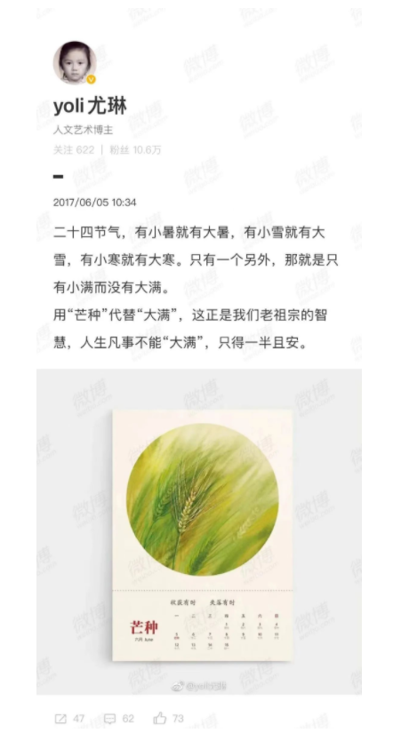 其实道歉之后还有后续,“北大满哥”也被爆抄袭,所谓“小满”文案被网友考古发现,2017年就有网友发表,“二十四节气,有小暑就有大暑,有小雪就有大雪,有小寒就有大寒。只有一个另外,那就是只有小满,而没有大满。用‘芒种’代替‘大满’,这正是我们老祖宗的智慧,人生凡事不能‘大满’,只得一半且安。”还有人继续往前发掘,寻找发端。