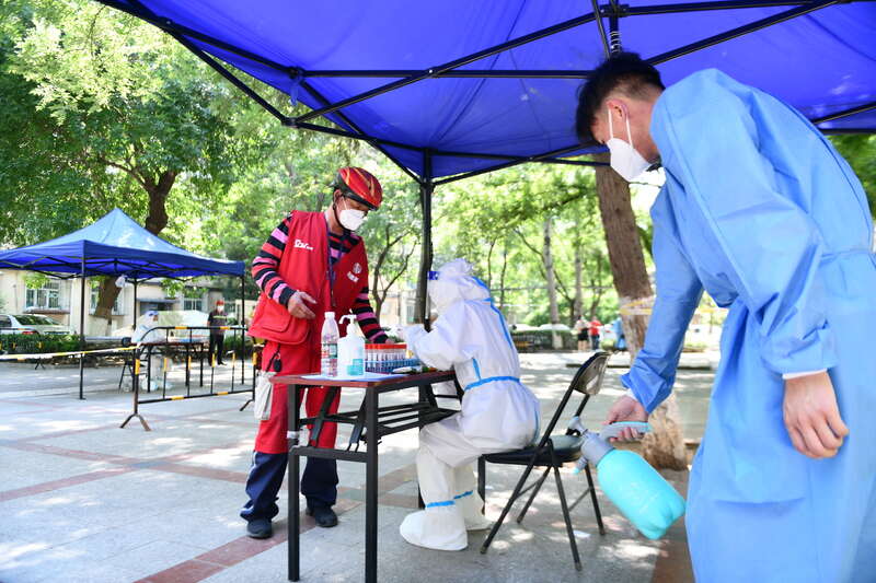 刚刚过去的这个周末,北京高温,区域核酸筛查持续进行。图为北京市朝阳区团结湖中路南三条小区核酸检测点。