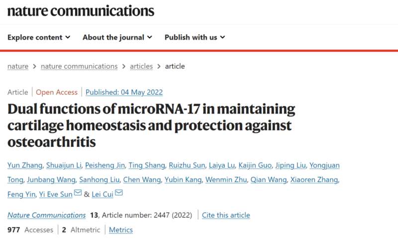 近日,同济大学附属东方医院及附属同济医院的联合研究团队在国际著名学术期刊《自然·通讯》(Nature Communications)在线发表了题为“Dual functions of microRNA-17 in maintaining cartilage homeostasis and protection against osteoarthritis”的研究论文,发现了骨关节炎新的发病机制,报道了微小RNA-17(miR-17)通过抑制缺氧诱导因子HIF-1α和多种基质降解酶,发挥了维持关节软骨生理性更新以及抑制骨关节炎软骨破坏的双重作用,确定了miR-17是骨关节炎诊断、预防和治疗的重要靶点。