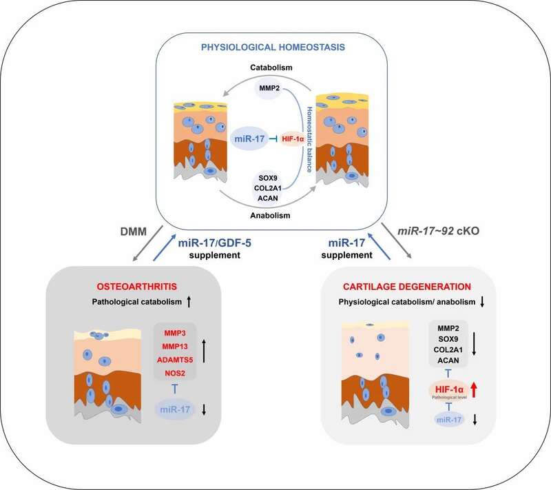 研究团队发现miR-17~92敲除小鼠的关节软骨在无外界损伤下发生病变,表层软骨细胞数量减少,软骨基质水肿且疏松,但是不伴有病理性分解基因的上调。研究团队为阐明软骨自发性退变的机理,运用单细胞RNA测序技术并分析发现表层软骨含有两种细胞,其一分泌生理性分解酶(MMP2、MMP14等),以维持软骨组织更新;其二分泌润滑素并呈现关节滑膜内层细胞特征,暗示了与滑膜组织的发育同源性。敲除miR-17~92软骨细胞的合成表型和生理性分解因子的表达均显著下调,关节腔内注射miR-17后能恢复合成和分解因子的稳态水平,维持软骨组织的正常结构,进一步证明了miR-17的核心作用。研究人员对测序数据进行深入分析,发现了若干胶原修饰酶在miR-17~92敲除软骨细胞中表达升高,且这些酶受到HIF-1α蛋白的调控。研究者证实了miR-17~92敲除鼠关节软骨组织中HIF-1α表达显著增强,并通过一系列实验阐明miR-17是软骨细胞中HIF-1α的负向调控因子,miR-17直接靶向并限制HIF-1α的过度表达,以维持细胞正常的代谢水平和软骨组织生理性稳态(图2)。此研究相关发明专利(一种抑制骨关节炎的microRNA及其应用)已于 2019年获得授权。