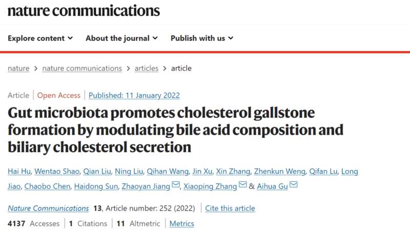 最近,附属东方医院联合南京医科大学研究团队的合作研究成果也发表于《自然・通讯》。该研究发现肠道脱硫弧菌通过调节胆汁酸组成和胆汁胆固醇分泌促进胆固醇性胆囊结石的形成。