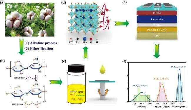 图1. (a)棉籽提取纤维素衍生物;(b)纤维素衍生物的分子结构;(c)钙钛矿前驱体溶液及其薄膜制备示意图;(e)钙钛矿太阳能电池结构图;(f)基于纤维素衍生物体相钝化电池的效率分布图。