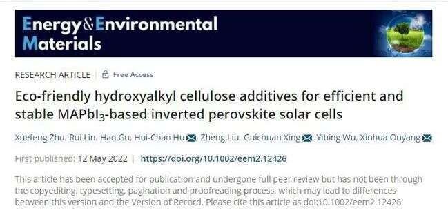 2022年5月12日,材料工程学院绿色光电器件与储能电池研究团队在材料科学领域国际权威期刊Energy & Environmental Materials(能源与环境材料,中科院一区TOP期刊)在线发表了题为“Eco-friendly hydroxyalkyl cellulose additives for efficient and stable MAPbI3-based inverted perovskite solar cells”(利用环境友好型羟烷基取代纤维素作为添加剂获得高效稳定的MAPbI3反型钙钛矿太阳能电池)的研究成果。