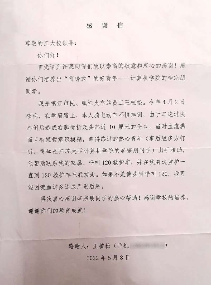 江苏大学收到镇江火车站职工王植松
