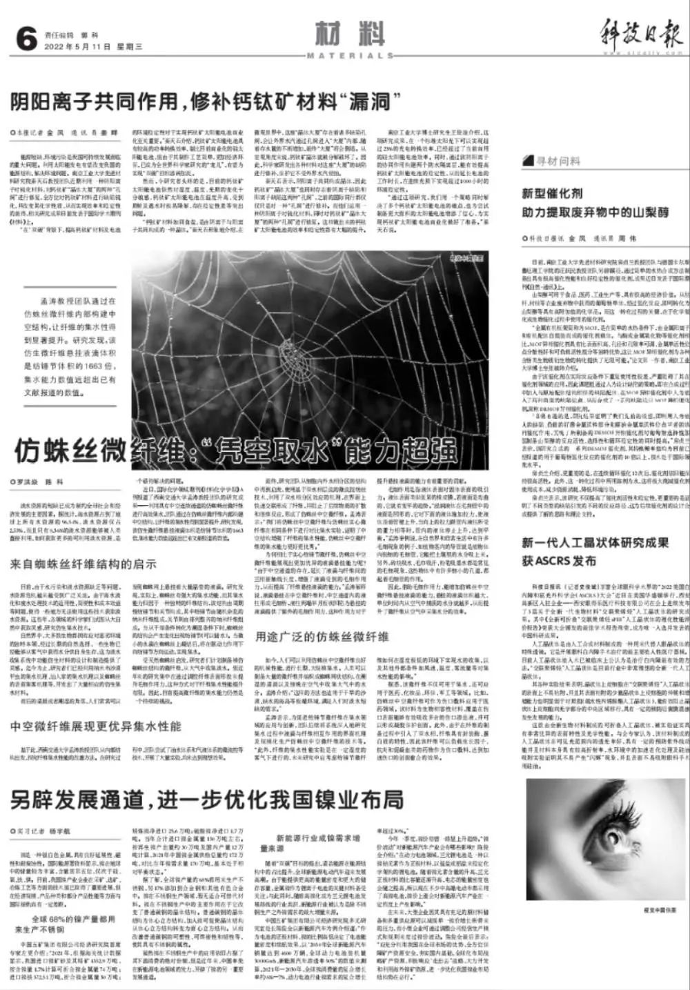 雨后的清晨或者潮湿的角落,人们常常可以发现蜘蛛网上悬挂着大量晶莹的液滴。研究发现,实际上,蜘蛛丝有强大的集水功能,而其集水能力归因于一种独特的纤维结构,该结构由周期性纺锤节和关节构成,其中纺锤节由随机杂乱的纳米纤维组成,关节则由排列整齐的纳米纤维组成。当从干燥条件转化为潮湿条件下时,蜘蛛丝的结构会产生变化出现纺锤节(可以储水)。当微小的水滴在蜘蛛丝上凝结后,将在驱动力作用下向纺锤节方向运动,实现集水。