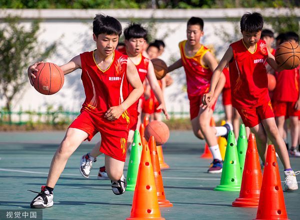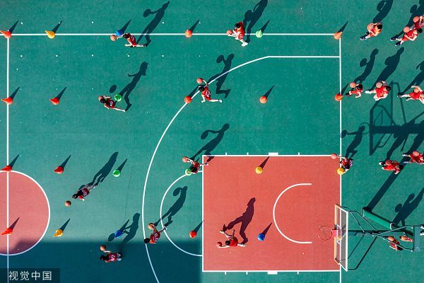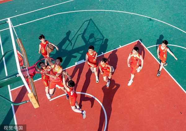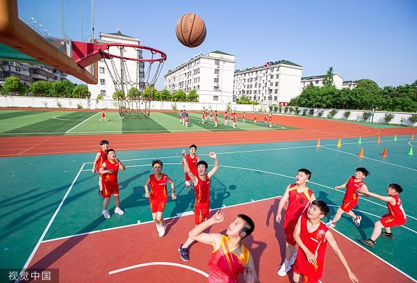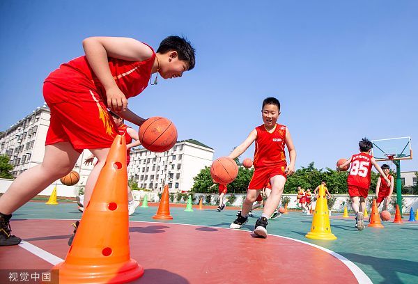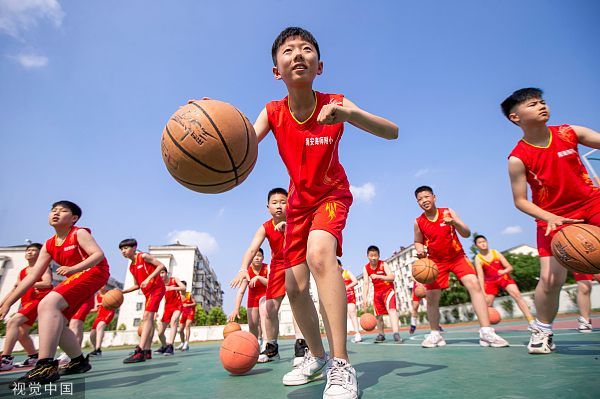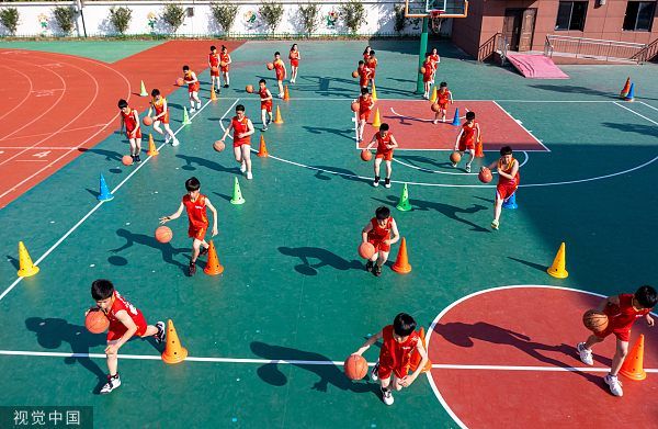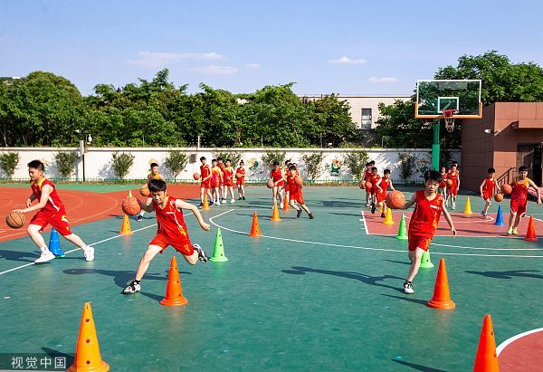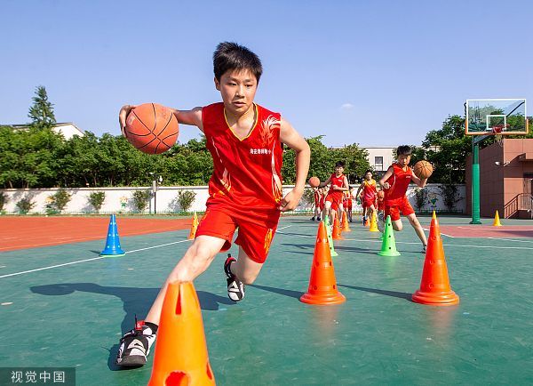 2022年5月23日,江苏省南通市,海安市教师发展中心附属小学乡村“复兴少年宫”的孩子们,在课后延时服务时间练习篮球基本功。