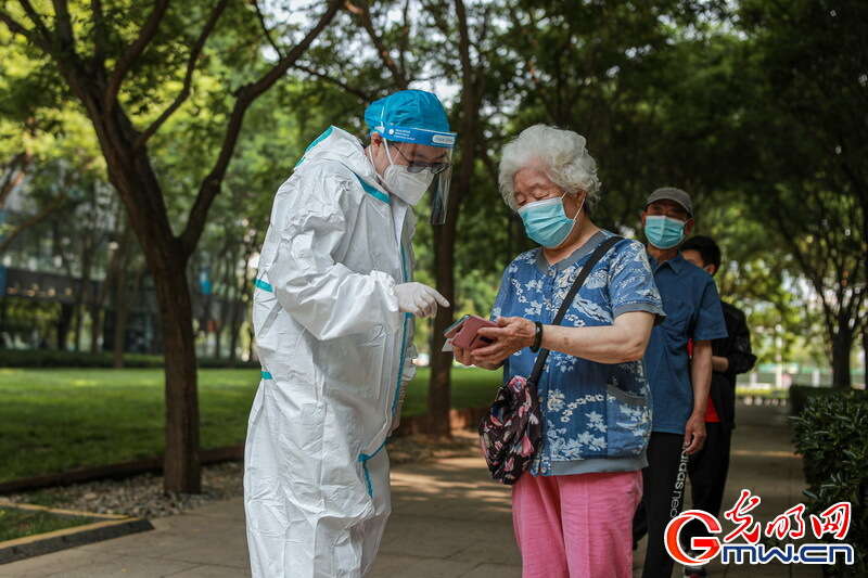 2022年5月21日,北京市朝阳区万通中心附近,一处绿荫下的核酸检测点。医护人员陈俊华为市民做采样。(贾天勇摄/光明图片/视觉中国)