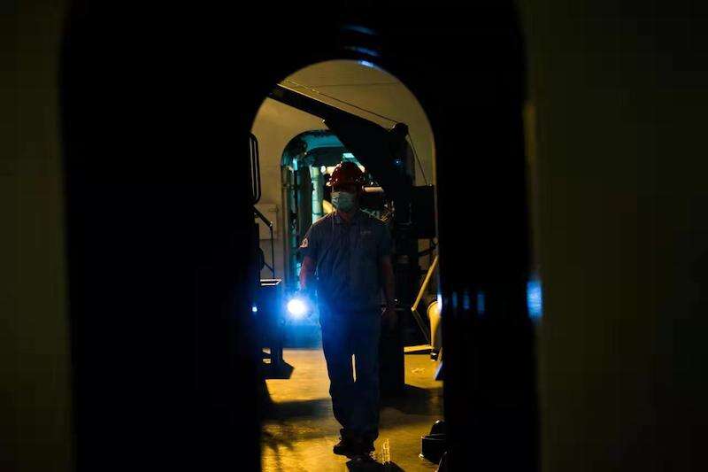 凌晨两点,21号船轮机员何鹏程来到了机舱,检查发电机的运行情况。