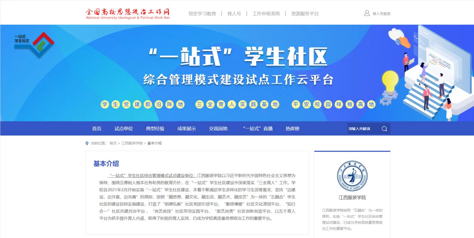 江西服装学院将以“一站式”学生社区综合管理模式建设试点为契机,全方位推进“三全育人”体系建设,形成部门联动、全员参与的“一站式”学生社区管理模式,提升学校思政工作育人水平。