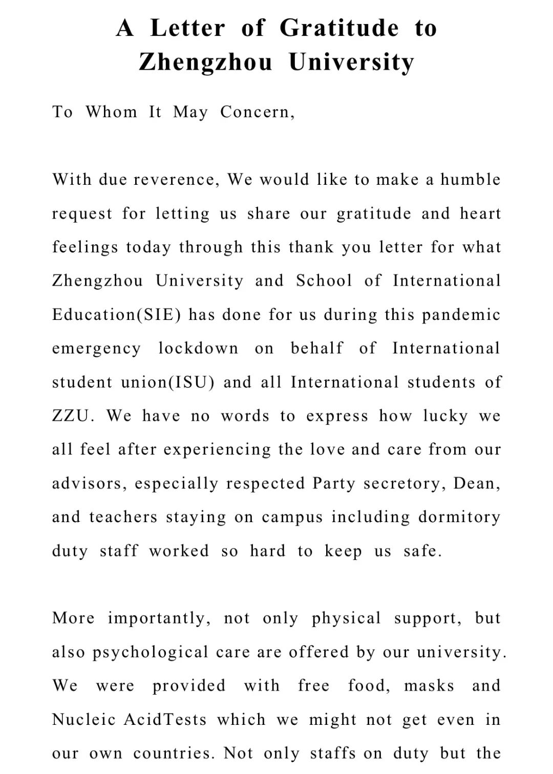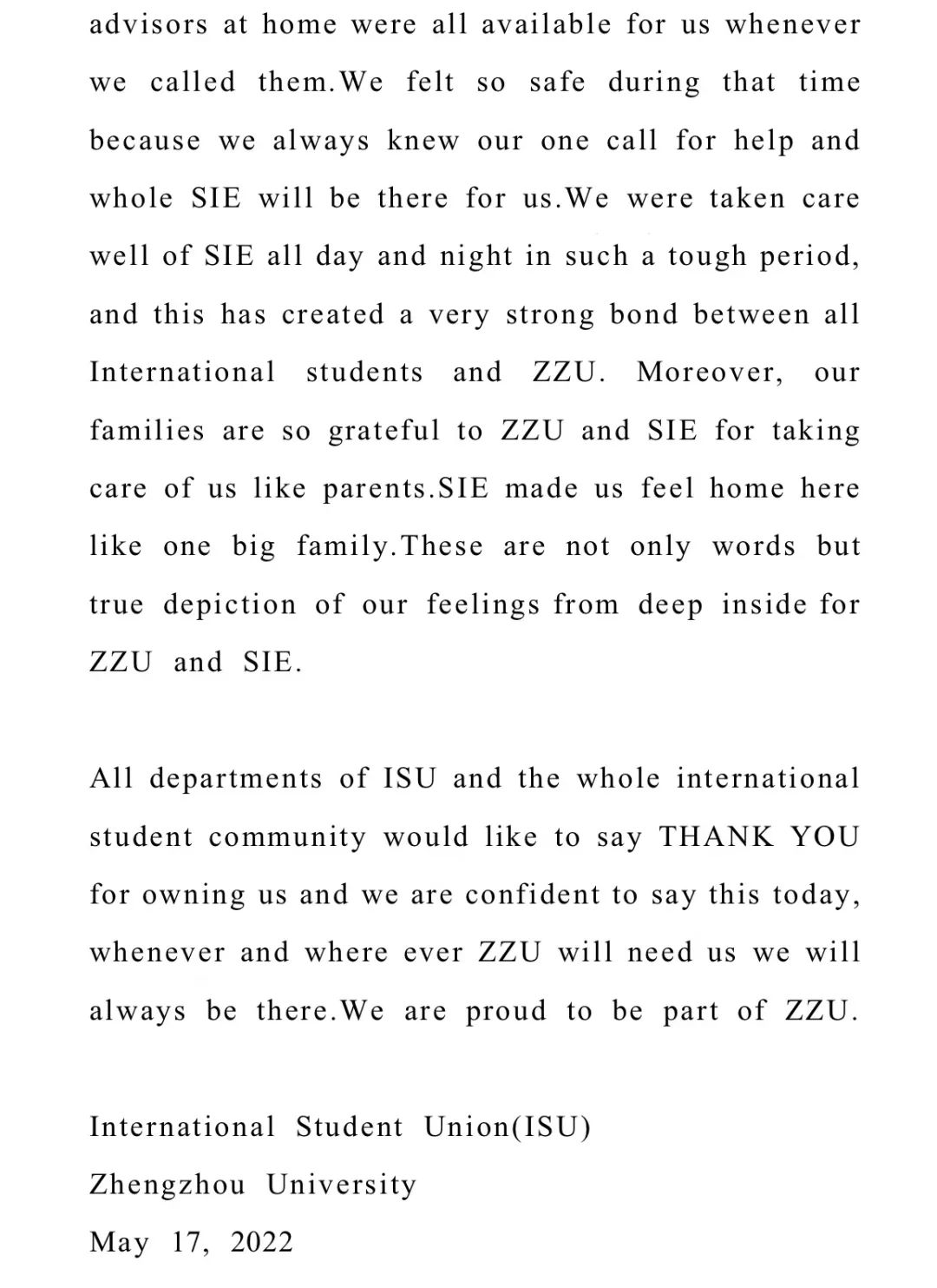 我们怀着敬意之心,想借此感谢信表达我们的感激之情和内心感受。在此谨代表国际学生会和郑州大学全体留学生向郑州大学和国际教育学院在此次疫情紧急封锁期间为我们所做的一切表示感谢。我们切身感受到了来自辅导员,特别是学院党总支书记、院长、所有留校老师和宿舍值班人员的关心与关爱,他们为我们的安全辛苦付出,我们无法用语言来表达我们是多么的幸运!