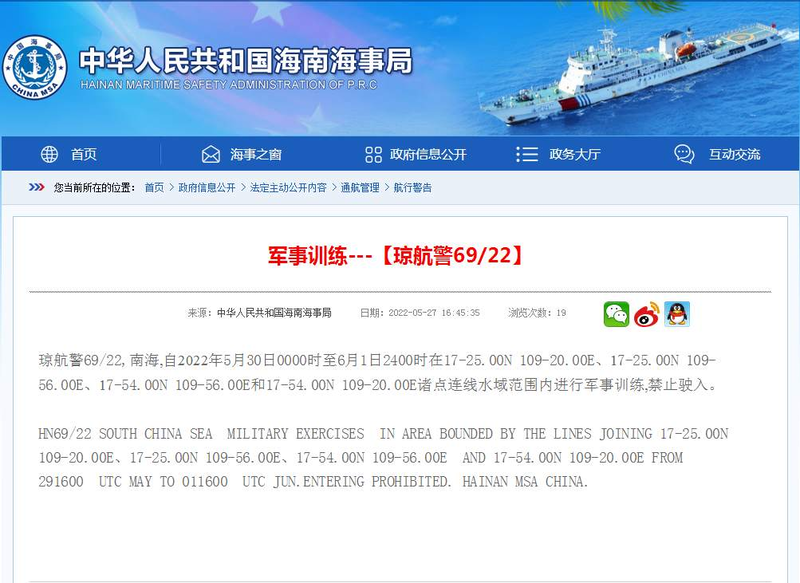 据海南海事局官网发布的航行警报:琼航警69/22,南海,自2022年5月30日0000时至6月1日2400时在17-25.00N 109-20.00E、17-25.00N 109-56.00E、17-54.00N 109-56.00E和17-54.00N 109-20.00E诸点连线水域范围内进行军事训练,禁止驶入。