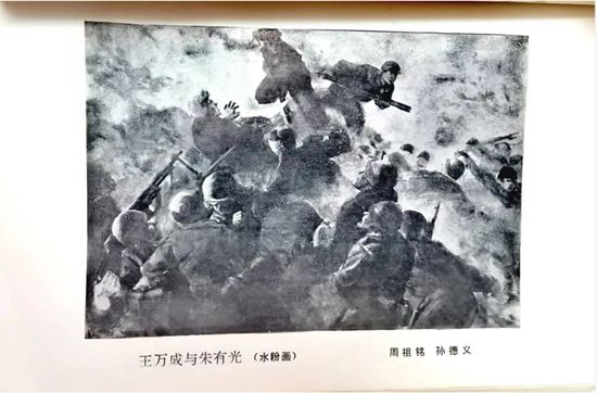 当他们进至1号阵地4、5公尺时,山头上已涌上成群的敌人,接着向他们投手榴弹。他俩拾起落在近旁的手榴弹扔回去。可是,下面的二三百个敌人又一窝蜂地涌上阵地。在此千钧一发之际,朱有光抱着两根冒烟的爆破筒,高声喊道:”共产党万岁!毛主席万岁“的口号冲进敌人群,王万成也操起两根爆破筒紧随其后,并大声喊道:”同志们,冲啊!“。